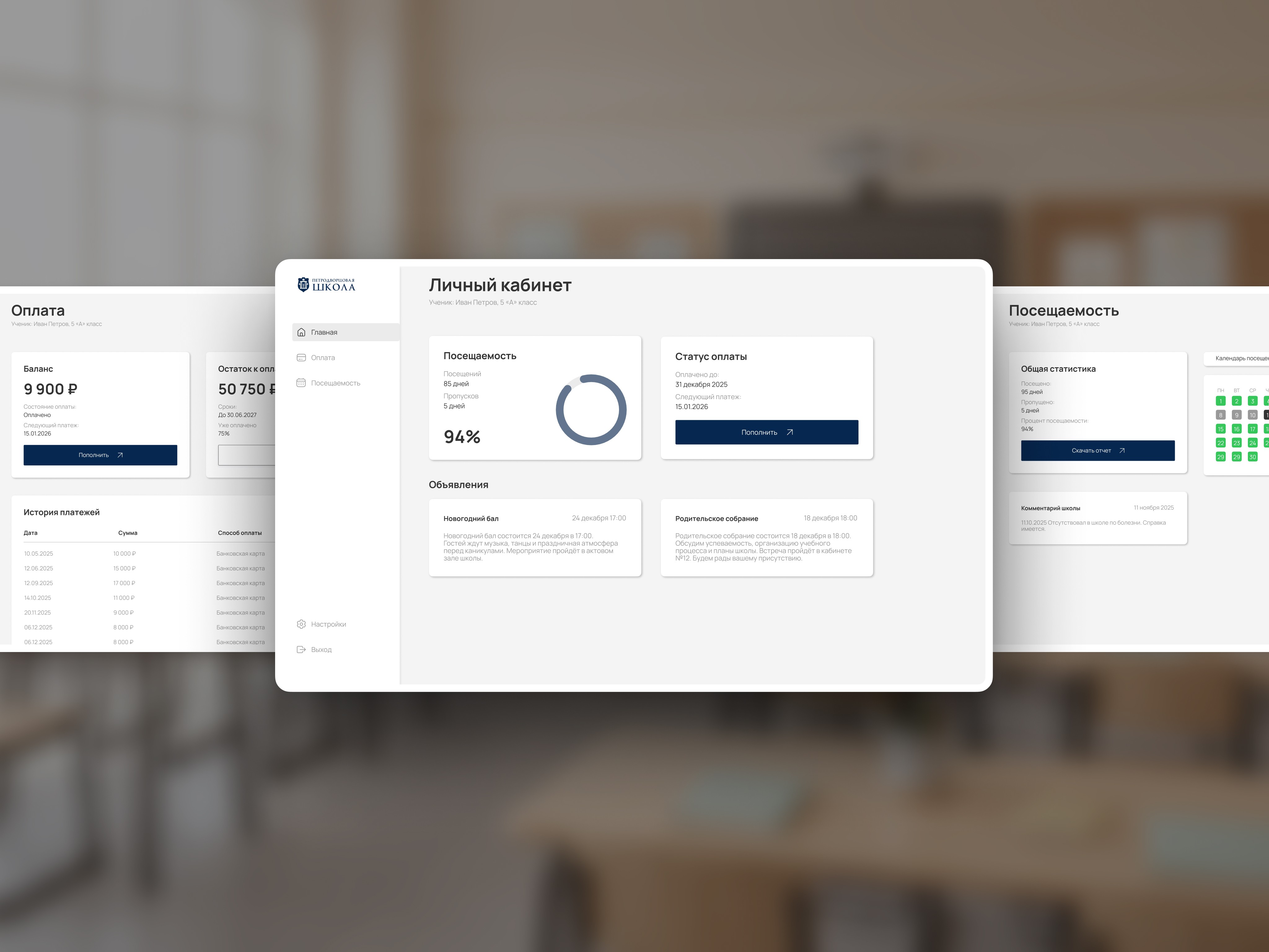 Сначала собрал структуру сайта и основные сценарии: просмотр информации о школе, доступ к данным в личном кабинете, навигация между разделами. После этого спроектировал интерфейсы главной страницы и кабинета, сделав упор на простоту, читаемость и понятную навигацию.